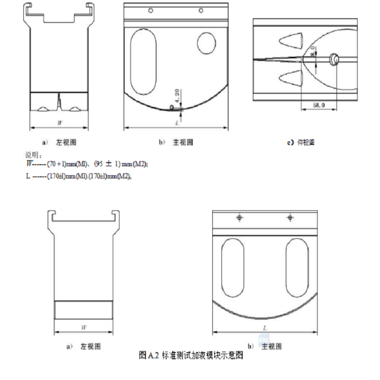 時單兀距離標準測試加液模塊zui底部為4.2±0.2)mm,在模塊的前段設罟:有一個弧形內凹的吸收區 域,在吸收區域內的下部有一個出液口,出液口距離標準測試加液模塊弧形zui底部的直線距離為58.0 ±0.5)mm,在測試加液模塊的底部中間有一個寬度漸變的溝槽,溝槽zui大寬度尺寸為8.0±0.2)mm, 同時與吸收區域連通,在溝槽的兩側有凸起結構。